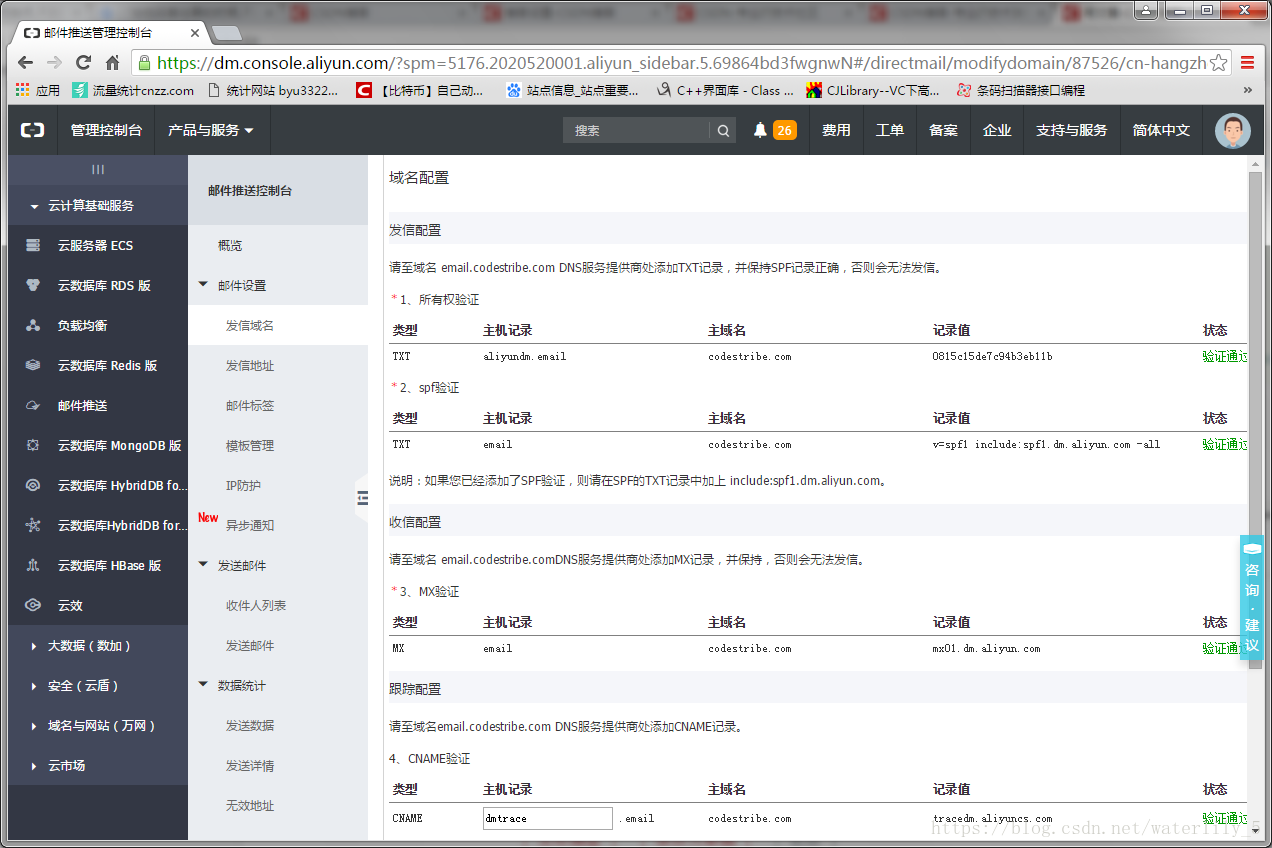 通过邮件推送按钮进入邮件推送控制台(截图是已经配置好了再回头来截的图,新创建的发信域名状态是黄色的待验证)