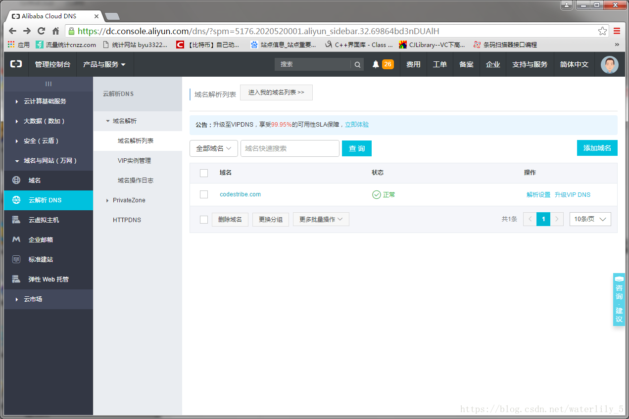 到这一步后新打开一个浏览器窗口(不一定需要新开窗口,只是新开窗口方便操作),新窗口中打开管理控制台-域名与网站(万网)-云解析DNS