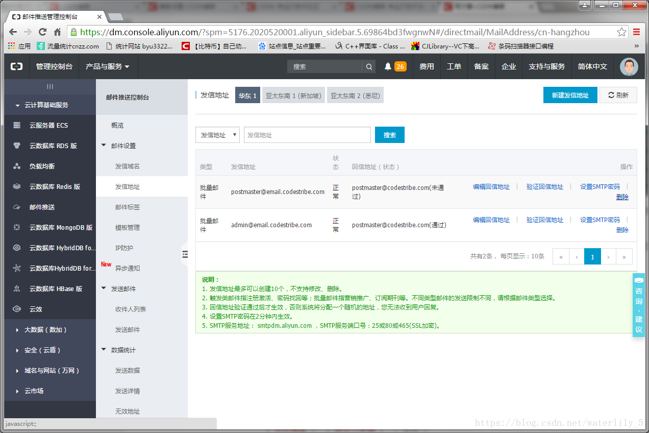 然后需要新建发信地址,邮件推送控制台上点击发信地址按钮进入发信地址设置页面: