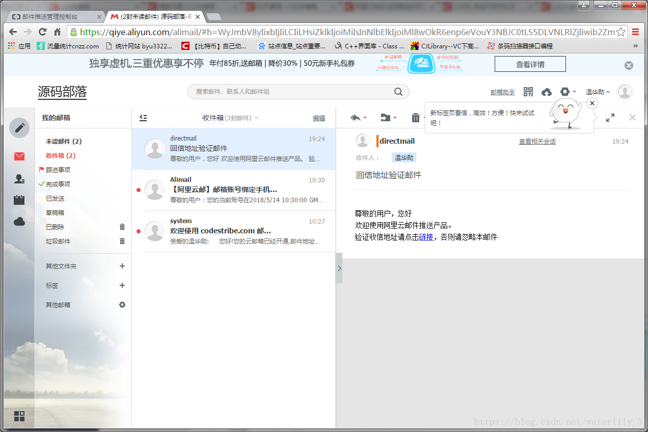 由于我填写了回信地址,所以需要验证回信地址,点击验证回信地址,在弹出的确认窗口点击确认,阿里云会发送一封验证邮件到填写的回信地址中